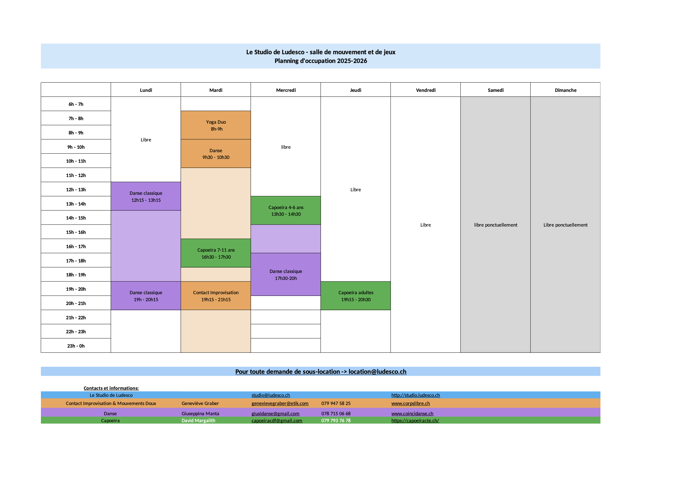 Le Studio est le nom donné au local de Ludesco se trouvant au 4e étage de la Maison de Peuple, Rue de La Serre 68. Il est pourvu d’un tapis de danse et se prête donc particulièrement bien à des cours de danse, de théâtre, de yoga et évidemment à bien d’autres activités de mouvement.